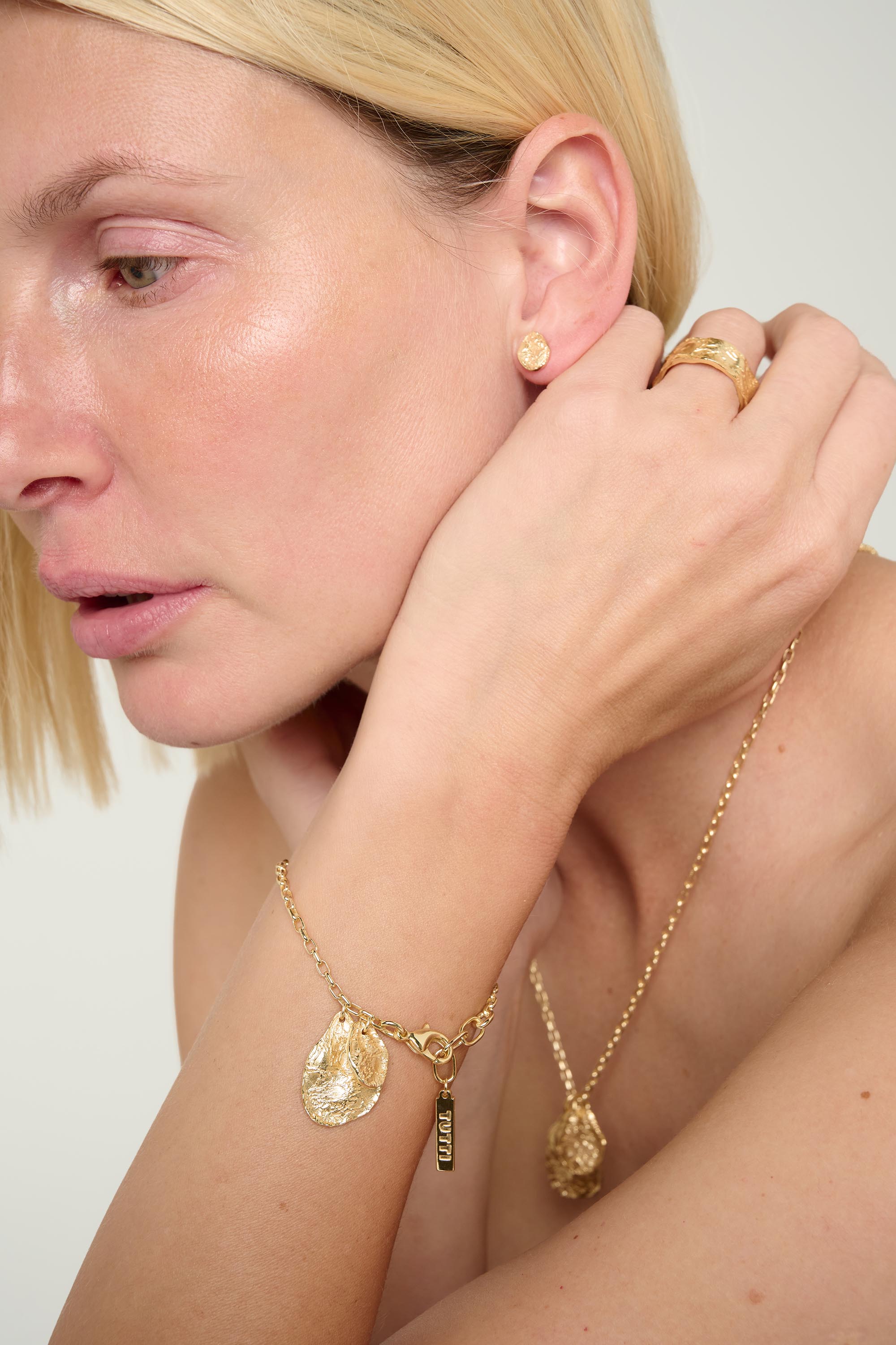 Our collections are made from 98% recycled metals, sourced from our trusted Italian suppliers. Each piece is crafted from a solid brass base, plated with 925 Sterling Silver. Our Gold styles are then plated with a considered, gold-tone finish.