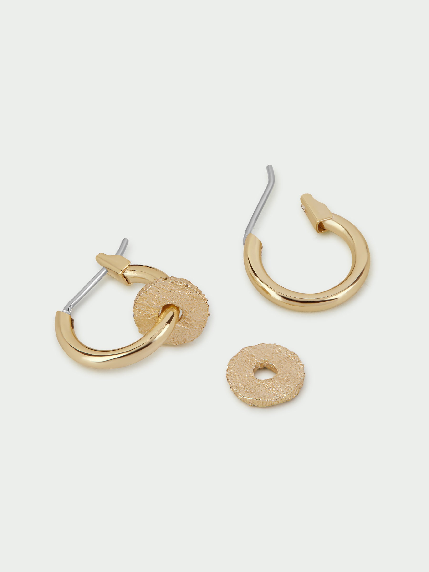 • Huggie hoops with textured disc drop