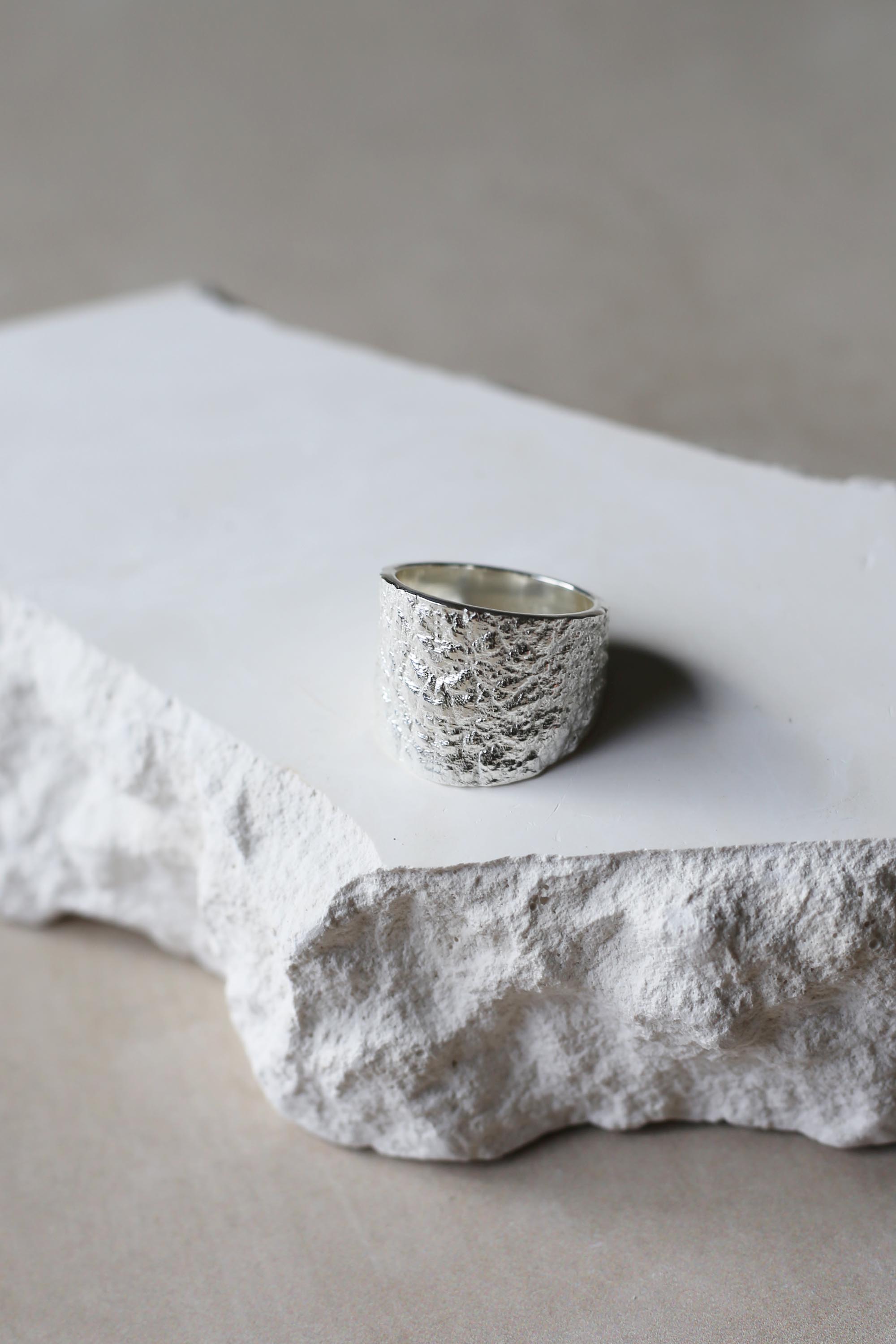 Oversized ring with rippled texture, inspired by the coastline.